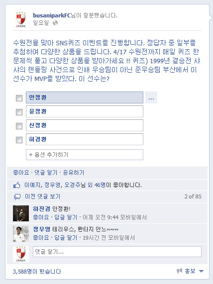 부산 아이파크가 17일 1위 수원 삼성을 홈으로 불러들여 2012-2013 현대오일뱅크 K리그 클래식 7라운드 경기를 치른다. 부산구단은 수원전을 맞아 페이스북 (www.facebook.com/bsipark)에서 히스토리 퀴즈이벤트를 진행한다. 두 팀의 역사에 관련된 퀴즈의 정답을 맞추면 갖가지 상품을 얻을 수 있다.
