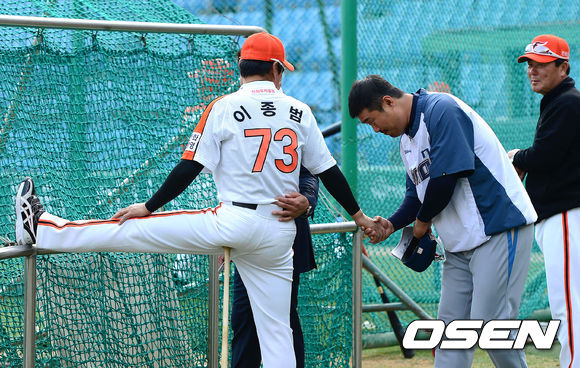 16일 오후 대전 한밭종합운동장 야구장에서 열린 2013 한국야쿠르트 세븐프로야구 한화 이글스와 NC 다이노스의 경기, 경기에 앞서 한화 이종범 코치가 NC 이호준과 악수를 나누고 있다.