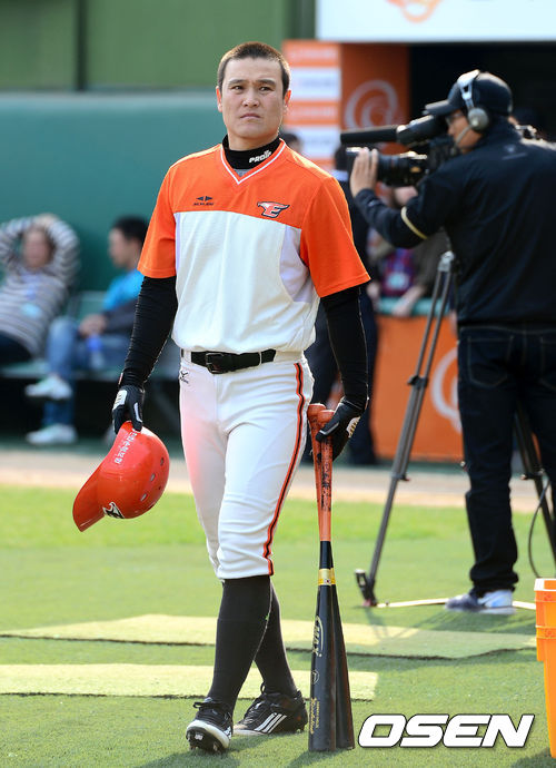16일 오후 대전 한밭종합운동장 야구장에서 열린 2013 한국야쿠르트 세븐프로야구 한화 이글스와 NC 다이노스의 경기, 경기에 앞서 한화 이대수가 타격 훈련을 위해 그라운드로 나가고 있다.