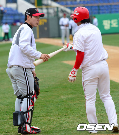 16일 오후 광주구장에서 열리는 '2013 한국야쿠르트 세븐 프로야구' KIA 타이거즈 대 LG 트윈스의 경기를 앞두고 LG 현재윤과 KIA 김선빈이 대화를 나누고 있다.