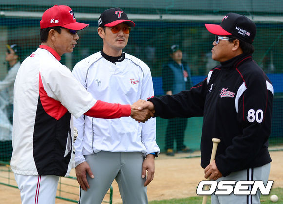 16일 오후 광주구장에서 열리는 '2013 한국야쿠르트 세븐 프로야구' KIA 타이거즈 대 LG 트윈스의 경기를 앞두고 KIA 김용달 타격코치와 LG 김무관 타격코치가 인사를 나누고 있다.