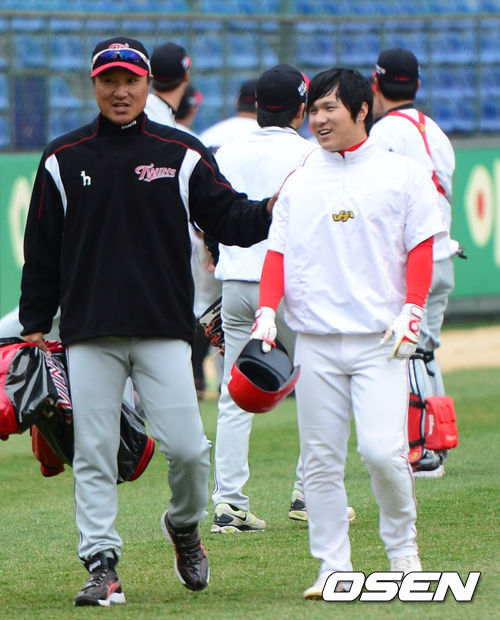 16일 오후 광주구장에서 열리는 '2013 한국야쿠르트 세븐 프로야구' KIA 타이거즈 대 LG 트윈스의 경기를 앞두고 LG 최태원 코치와 KIA 김선빈이 인사를 나누고 있다.