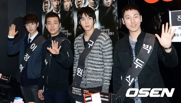 16일 오후 서울 영등포 CGV 영등포에서 진행된 영화 '전설의 주먹' F4 일일 미소지기 행사에서 이정혁, 박정민, 구원, 박두식이 포토타임을 갖고 있다.