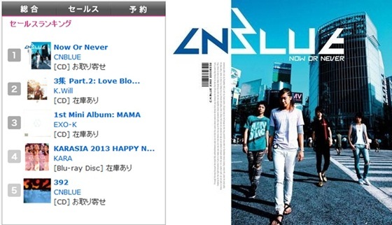 16일 일본 대형 음반체인점 HMV 측 발표에 따르면 지난 2009년 8월 발매한 씨엔블루 일본 인디즈 데뷔 음반인 '나우 오버 네버(Now or Never)'가 한국·아시아 부문 판매순위 1위에 올랐다. 2011년 9월 발매된 일본 인디즈 두번째 음반 '392'도 5위에 올랐다. 수년을 뛰어넘은 '초고속 역주행'인 셈.