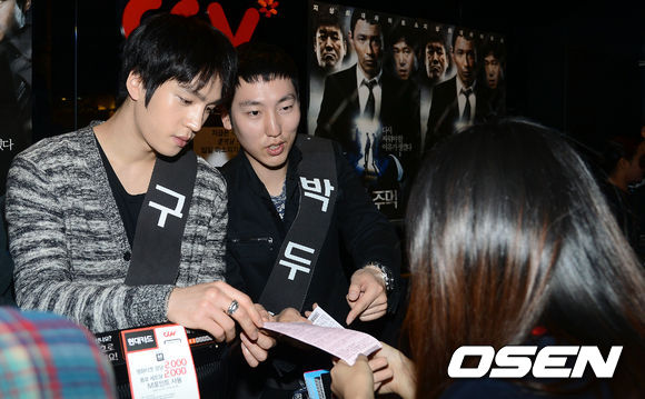 16일 오후 서울 영등포 CGV 영등포에서 진행된 영화 '전설의 주먹' F4 일일 미소지기 행사에서 구원과 박두식이 일일 미소지기 체험을 하고 있다.