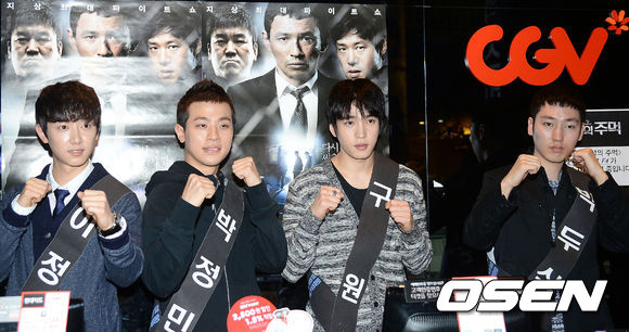 16일 오후 서울 영등포 CGV 영등포에서 진행된 영화 '전설의 주먹' F4 일일 미소지기 행사에서 이정혁, 박정민, 구원, 박두식이 포토타임을 갖고 있다.