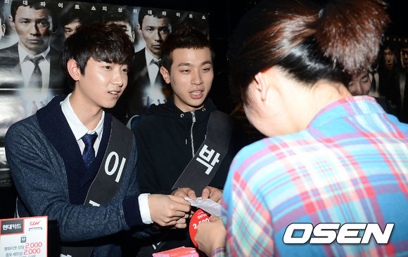 16일 오후 서울 영등포 CGV 영등포에서 진행된 영화 '전설의 주먹' F4 일일 미소지기 행사에서 이정혁과 박정민이 일일 미소지게 체험을 하고 있다.