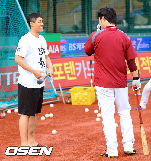 16일 오후 부산 사직구장에서 열리는 '2013 한국야쿠르트 세븐 프로야구' 롯데 자이언츠와 넥센 히어로즈의 경기, 경기에 앞서 넥센 박병호가 '찜닭, 힘!'이라는 문구가 새겨진 티셔츠를 입은 황재균과 이야기를 나누고 있다. 이 티셔츠는 평소 찜닭과 부대찌개를 먹고 힘을 냈다는 롯데 외국인투수 유먼이 사비로 200벌을 제작해 선수들에게 나눠준 선물이다.