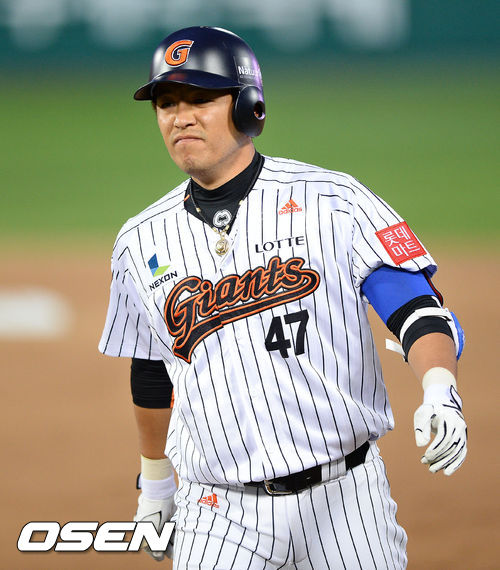 16일 오후 부산 사직구장에서 열린 '2013 한국야쿠르트 세븐 프로야구' 롯데 자이언츠와 넥센 히어로즈의 경기, 1회말 2사 2루 1군 복귀한 롯데 강민호가 외야플라이 타구를 날린 후 아쉬워하고 있다. 강민호는 지난 4일 대퇴부 근육통으로 1군 말소됐다