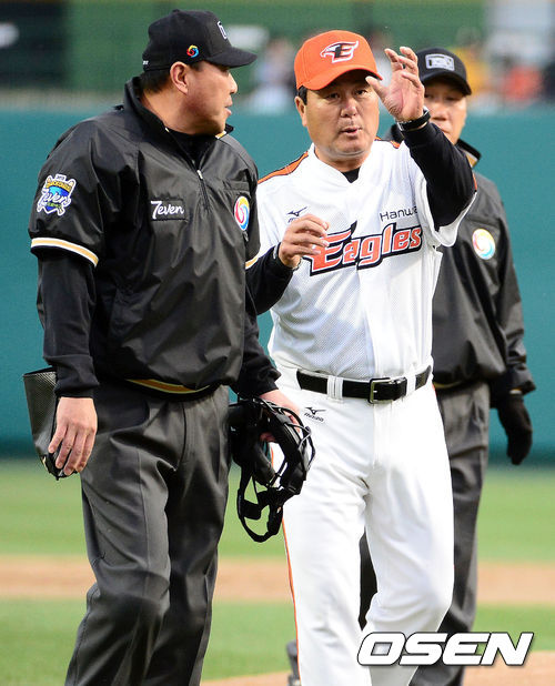 16일 오후 대전 한밭종합운동장 야구장에서 열린 2013 한국야쿠르트 세븐프로야구 한화 이글스와 NC 다이노스의 경기, 1회초 2사 2루에서 한화 정현석의 실책으로 실점을 하자 그라운드를 방문한 김성한 코치가 임채섭 주심에게 어필을 하고 있다.
