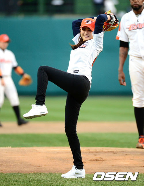 16일 오후 대전 한밭종합운동장 야구장에서 열린 2013 한국야쿠르트 세븐프로야구 한화 이글스와 NC 다이노스의 경기, 경기에 앞서 배우 이태임이 시구를 하고 있다.