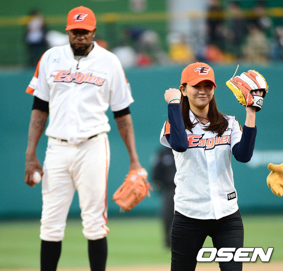 16일 오후 대전 한밭종합운동장 야구장에서 열린 2013 한국야쿠르트 세븐프로야구 한화 이글스와 NC 다이노스의 경기, 경기에 앞서 배우 이태임이 시구를 마치고 파이팅을 외치고 있다.