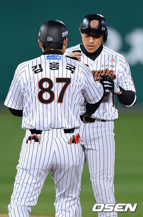 16일 오후 부산 사직구장에서 열린 '2013 한국야쿠르트 세븐 프로야구' 롯데 자이언츠와 넥센 히어로즈의 경기, 2회말 1사 1,2루 롯데 황재균이 선취 2타점 적시타를 김응국 코치와 하이파이브를 하고 있다