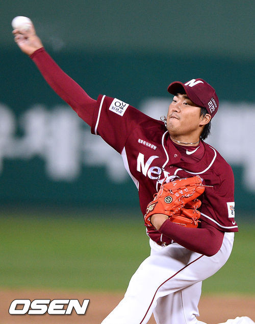 16일 오후 부산 사직구장에서 열린 '2013 한국야쿠르트 세븐 프로야구' 롯데 자이언츠와 넥센 히어로즈의 경기, 1회말 넥센 선발투수 김영민이 역투하고 있다