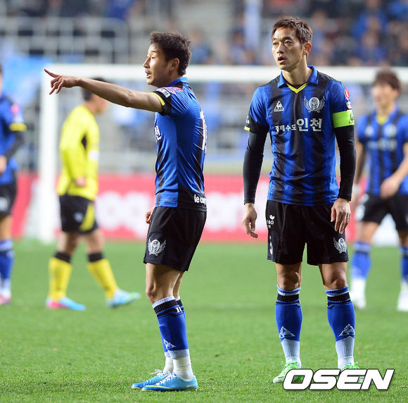 16일 오후 인천 축구전용경기장에서 열린 '현대오일뱅크 K리그 클래식' 인천 유나이티드와 전남 드래곤즈의 경기 전반 이천수(왼쪽)가 동료에게 지시를 하고 있다.