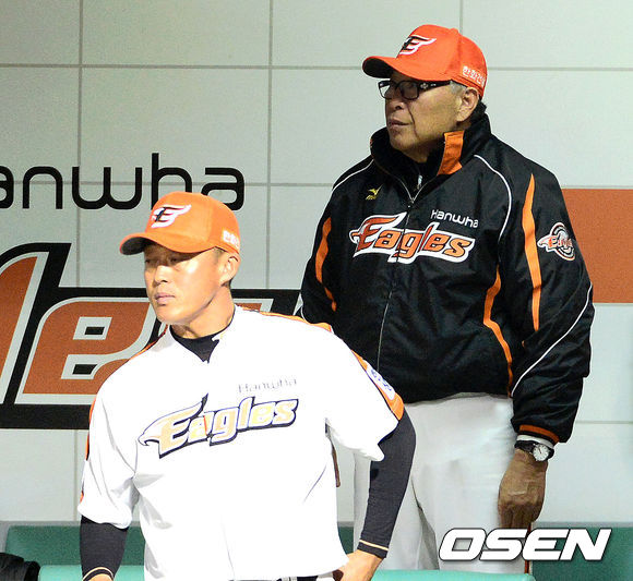 16일 오후 대전 한밭종합운동장 야구장에서 열린 2013 한국야쿠르트 세븐프로야구 한화 이글스와 NC 다이노스의 경기, 3회말 2사 2루에서 한화 최진행의 중전 적시타 때 김응룡 감독이 자리에서 일어나 상황을 지켜보고 있다.