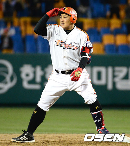 16일 오후 대전 한밭종합운동장 야구장에서 열린 2013 한국야쿠르트 세븐프로야구 한화 이글스와 NC 다이노스의 경기, 3회말 2사 1,2루에서 한화 김태균이 좌전 적시타를 치고 타임을 외치고 있다.