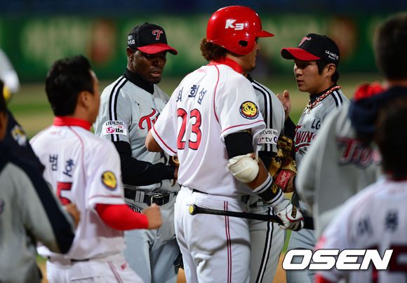 16일 오후 광주구장에서 '2013 한국야쿠르트 세븐 프로야구' KIA 타이거즈 대 LG 트윈스의 경기가 열렸다. 3회말 KIA 공격 1사 주자 없는 상황 4번 나지완이 LG 선발 리즈의 투구에 등을 맞은 뒤 양 팀 선수들이 그라운드로 달려나와 경기가 잠시 중단되고 있다.