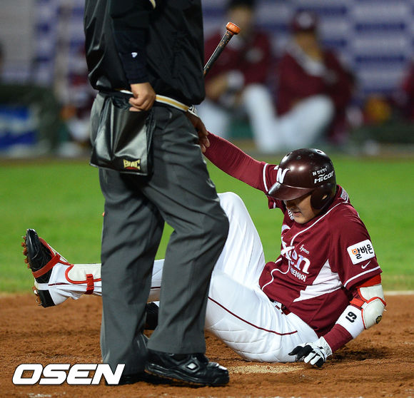 16일 오후 부산 사직구장에서 열린 '2013 한국야쿠르트 세븐 프로야구' 롯데 자이언츠와 넥센 히어로즈의 경기, 5회초 넥센 선두타자 유한준이 롯데 고원준의 높은 공을 피한 뒤 쓰러져 있다.