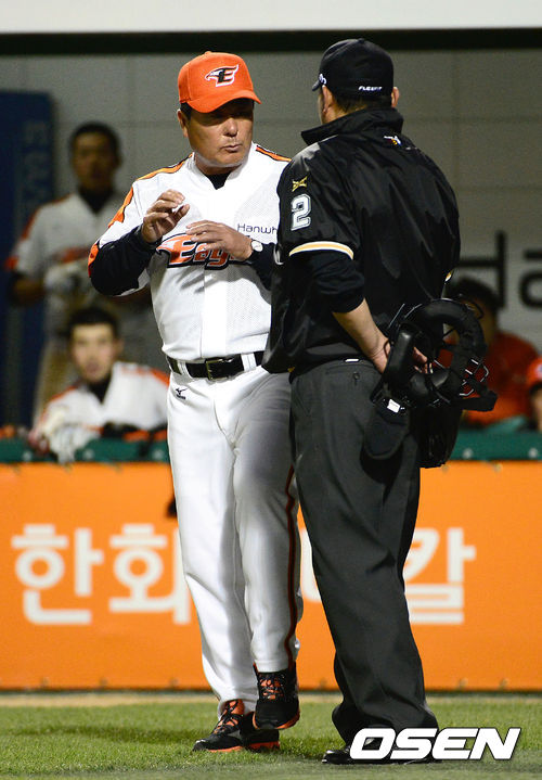 16일 오후 대전 한밭종합운동장 야구장에서 열린 2013 한국야쿠르트 세븐프로야구 한화 이글스와 NC 다이노스의 경기, 5회말 1사에서 한화 김태완 타석 때 김성한 코치가 임채섭 주심에게 NC 에릭의 투구 자세에 대해 어필을 하고 있다.