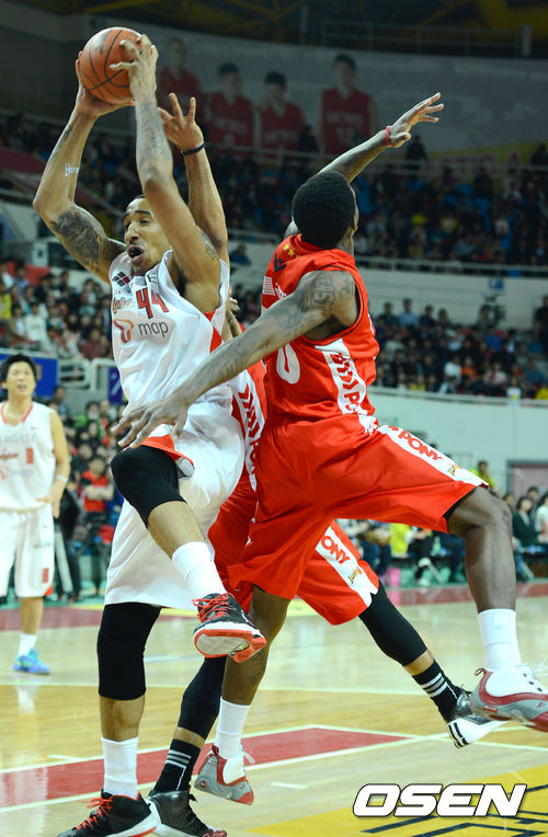 16일 오후 울산동천체육관에서 열린 '2012-2013 KB국민카드 프로농구 챔피언결정 3차전 울산 모비스와 서울 SK의 경기, 3쿼터 SK 심스와 모비스 라틀리프가 리바운드를 다투고 있다.