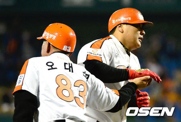 16일 오후 대전 한밭종합운동장 야구장에서 열린 2013 한국야쿠르트 세븐프로야구 한화 이글스와 NC 다이노스의 경기, 5회말 1사 1루에서 한화 김태균이 좌월 역전 투런 홈런을 치고 오대석 코치와 하이파이브를 하고 있다.