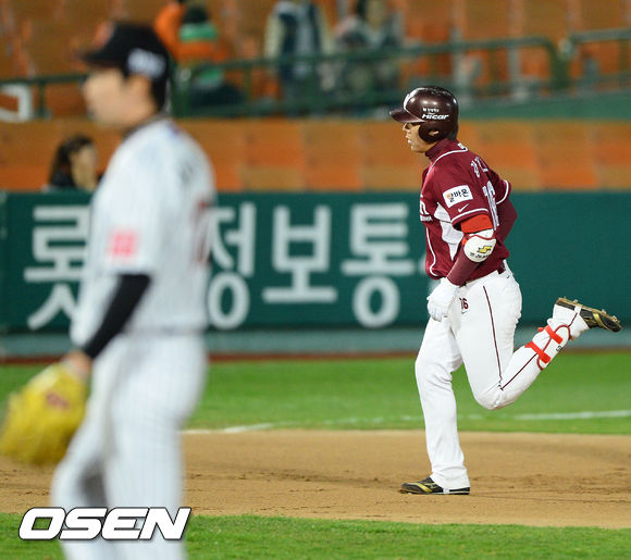 16일 오후 부산 사직구장에서 열린 '2013 한국야쿠르트 세븐 프로야구' 롯데 자이언츠와 넥센 히어로즈의 경기, 6회초 2사 2루 넥센 강정호가 2점 홈런을 날리고 베이스를 돌고 있다