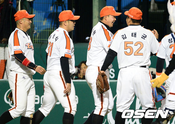 16일 오후 대전 한밭종합운동장 야구장에서 열린 2013 한국야쿠르트 세븐프로야구 한화 이글스와 NC 다이노스의 경기, 6회초 2사 만루에서 한화 김태완이 NC 김종호를 외야 플라이로 처리하고 덕아웃에서 동료들과 하이파이브를 하고 있다.