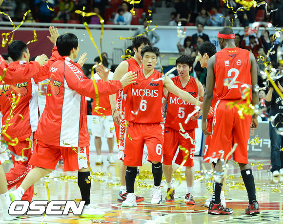 경기후 모비스 양동근이 동료선수들과 승리를 기뻐하고 있다. /ouxou@osen.co.kr