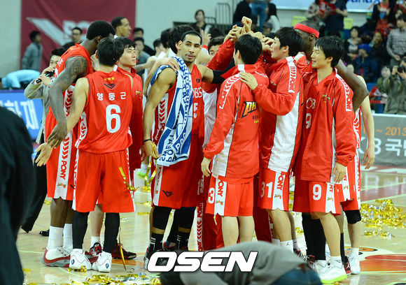 경기후 승리한 모비스 선수들이 기뻐하고 있다. /ouxou@osen.co.kr