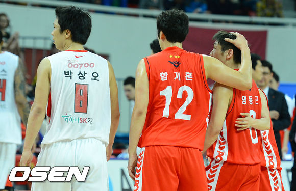 경기후 승리한 모비스 양동근과 함지훈이 인사를 나누고 있다. /ouxou@osen.co.kr