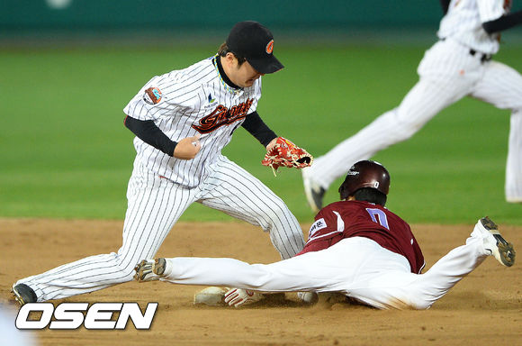 16일 오후 부산 사직구장에서 열린 '2013 한국야쿠르트 세븐 프로야구' 롯데 자이언츠와 넥센 히어로즈의 경기, 8회말 1사 1루 넥센 강정호의 타석때 1루 주자 유재신이 도루 성공하고 있다