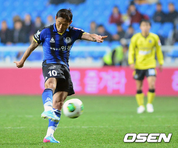 16일 오후 인천 축구전용경기장에서 열린 '현대오일뱅크 K리그 클래식' 인천 유나이티드와 전남 드래곤즈의 경기 후반 이천수가 슈팅을 하고 있다.