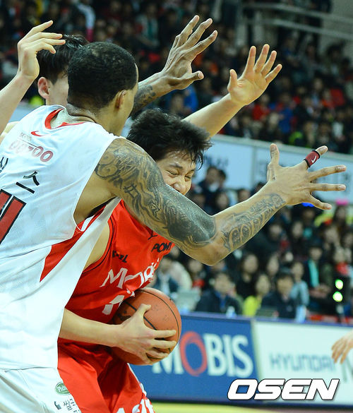 3쿼터, 모비스 함지훈이 SK 심스의 수비를 피해 골밑 돌파를 시도하고 있다. /ouxou@osen.co.kr