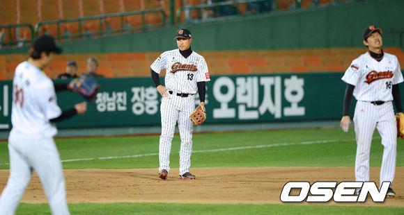 16일 오후 부산 사직구장에서 열린 '2013 한국야쿠르트 세븐 프로야구' 롯데 자이언츠와 넥센 히어로즈의 경기, 8회초 2사 1,2루 넥센 유한준의 내야땅볼의 타구를 놓친 롯데 황재균 3루수가 아쉬워하고 있다. 이 실책으로 롯데는 역전허용했다.