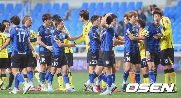 16일 오후 인천 축구전용경기장에서 열린 '현대오일뱅크 K리그 클래식' 인천 유나이티드와 전남 드래곤즈의 경기 종료 후 선수들이 인사를 나누고 있다.
