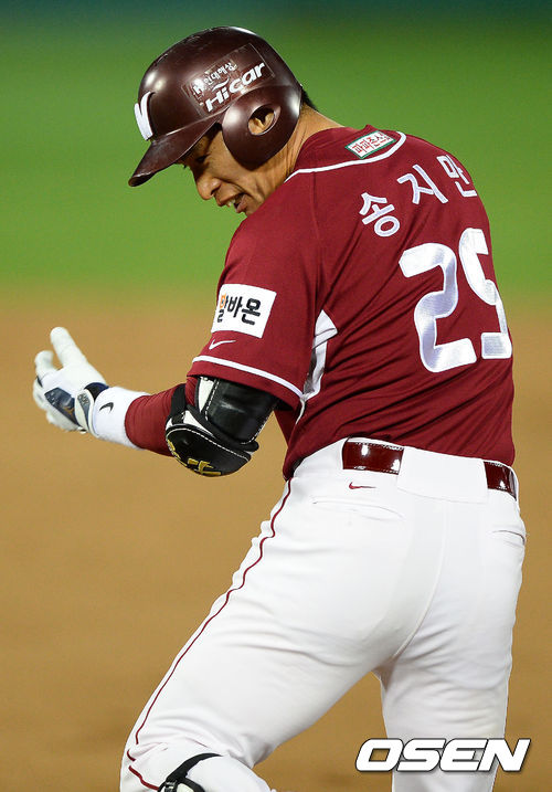 16일 오후 부산 사직구장에서 열린 '2013 한국야쿠르트 세븐 프로야구' 롯데 자이언츠와 넥센 히어로즈의 경기 8회초 2사 2,3루 넥센 송지만이 2타점 적시타를 날린후 환호하고 있다