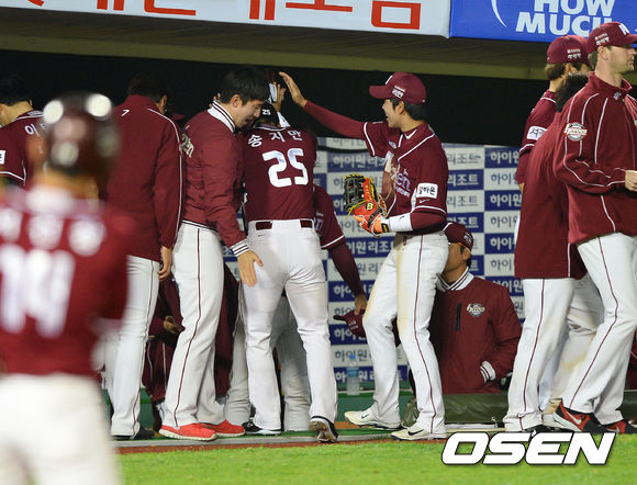 16일 오후 부산 사직구장에서 열린 '2013 한국야쿠르트 세븐 프로야구' 롯데 자이언츠와 넥센 히어로즈의 경기 8회초 2타점 적시타를 날린 송지만이 정수성과 교체 후 축하를 받으며 더그아웃으로 들어가고 있다