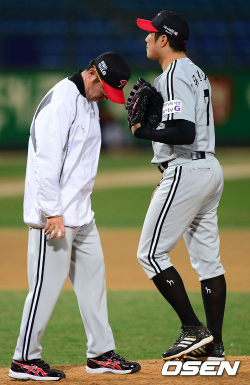 16일 오후 광주구장에서 '2013 한국야쿠르트 세븐 프로야구' KIA 타이거즈 대 LG 트윈스의 경기가 열렸다. 7회말 KIA 공격 1사 2, 3루 상황 4번 나지완에게 싹쓸이 2루타를 허용한 LG 투수 유원상이 마운드를 내려가고 있다.