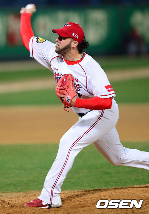 16일 오후 광주구장에서 '2013 한국야쿠르트 세븐 프로야구' KIA 타이거즈 대 LG 트윈스의 경기가 열렸다. 9회초 LG 공격 KIA 마무리투수 앤서니가 힘차게 공을 던지고 있다.