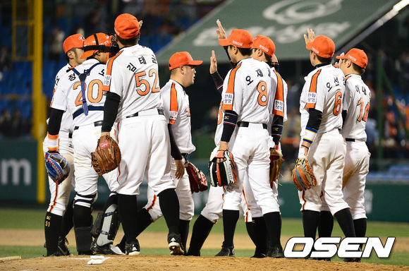 경기 종료 후 한화 선수들이 승리의 기쁨을 나누고 있다. /sunday@osen.co.kr