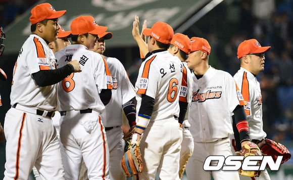 경기 종료 후 한화 선수들이 승리의 기쁨을 나누고 있다. /sunday@osen.co.kr