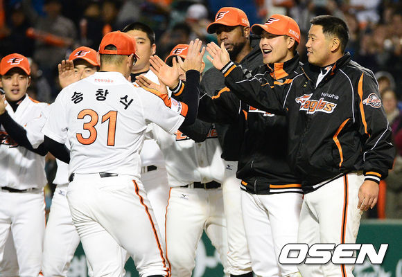 경기 종료 후 한화 송창식이 동료들과 승리의 기쁨을 나누고 있다. /sunday@osen.co.kr