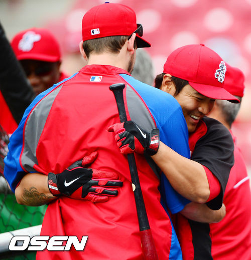 클리블랜드에서 추신수와 함께 뛰었고 어제 경기에서 선발 등판 한 필라델피아의 에이스 ‘클리프 리’가 신시내티 추신수와 포옹을 하고 있다.