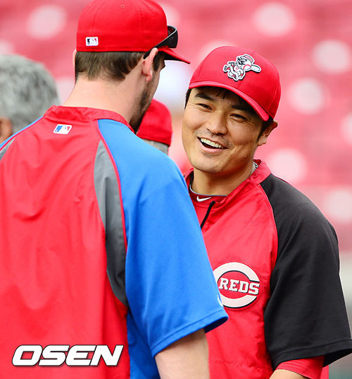 클리블랜드에서 추신수와 함께 뛰었고 어제 경기에서 선발 등판 한 필라델피아의 에이스 ‘클리프 리’가 신시내티 추신수와 포옹을 나눈후 다정하게 얘기를 나누고 있다.