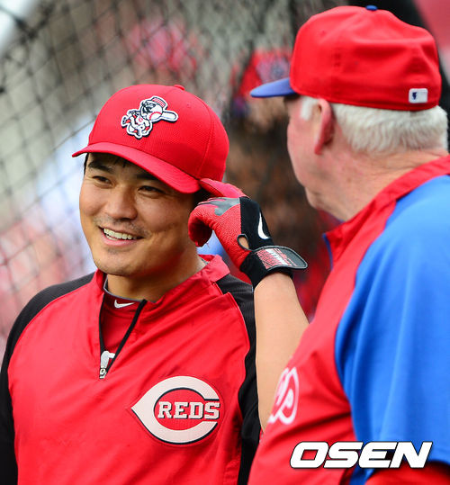 필라델피아 찰리 매뉴얼 감독이 신시내티 추신수와 즐겁게 얘기를 나누고 있다.