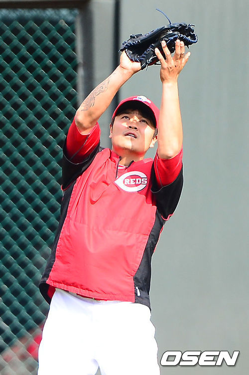 신시내티 추신수가 수비훈련을 하고 있다.