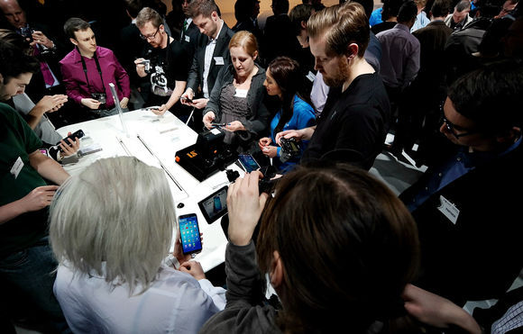 '갤럭시 S4'를 소개하는 김석필 삼성전자 구주총괄 부사장(위)과 현장에서 제품을 체험해보고 있는 참석자들.