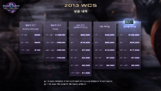 명실상부한 세계 최고 권위를 가지고 있는 WCS는 블리즈컨에서 오는 11월 열린다. 우승상금은 10만 달러(한화 1억 1000만원)로 예전과 달라진 것이 없고, WCS 지역대회로 흡수된 GSL, 스타리그 같은 경우는 기존 5000만원 4000만원의 우승 상금이 절반 수준에 못 미치는 2만달러(2200만원)로 대폭 줄어들었다.