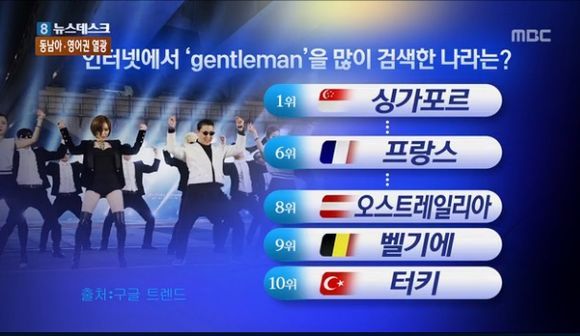 ‘뉴스데스크’는 지난 16일 가수 싸이의 신곡 ‘젠틀맨’ 인기 소식을 전하던 중 ‘인터넷에서 젠틀맨을 가장 많이 검색한 나라’를 소개했다.